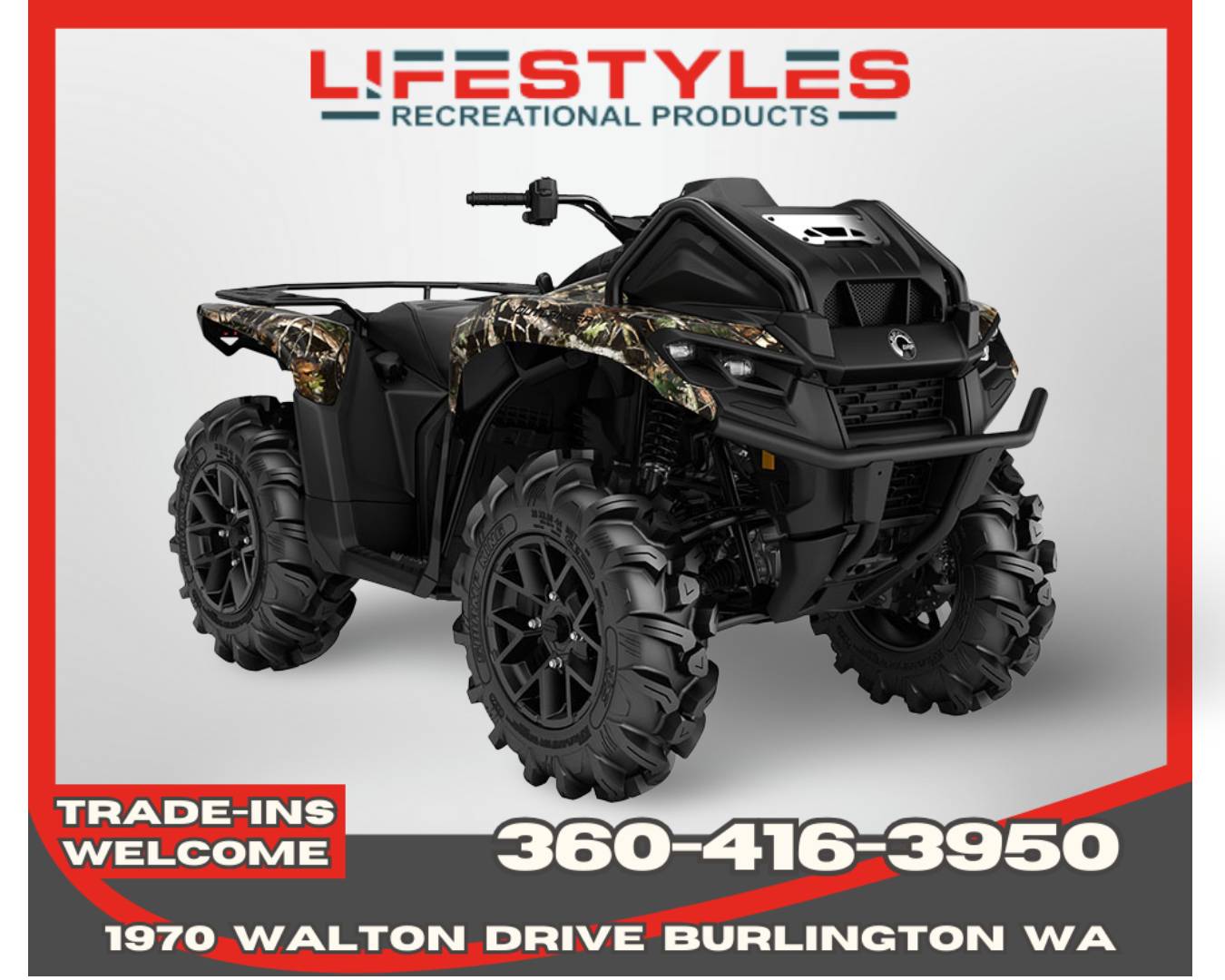 The most accessible mud-ready ATV on the market. Built to last, and engineered to take on mud on its own terms! Snorkeled CVT/engine intake and exhaust, relocated radiator, Visco-4Lok front Differential, and Rotax power to go!