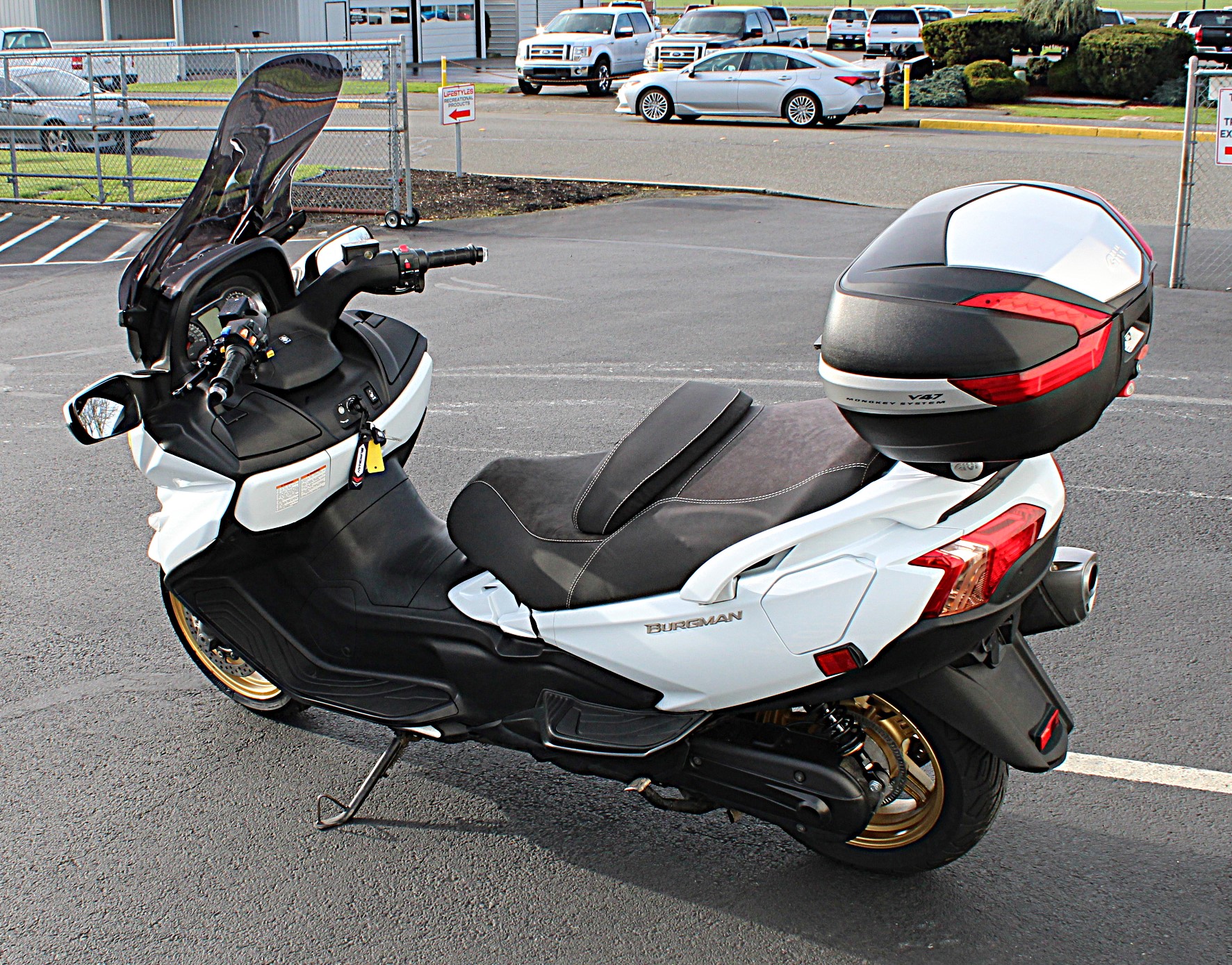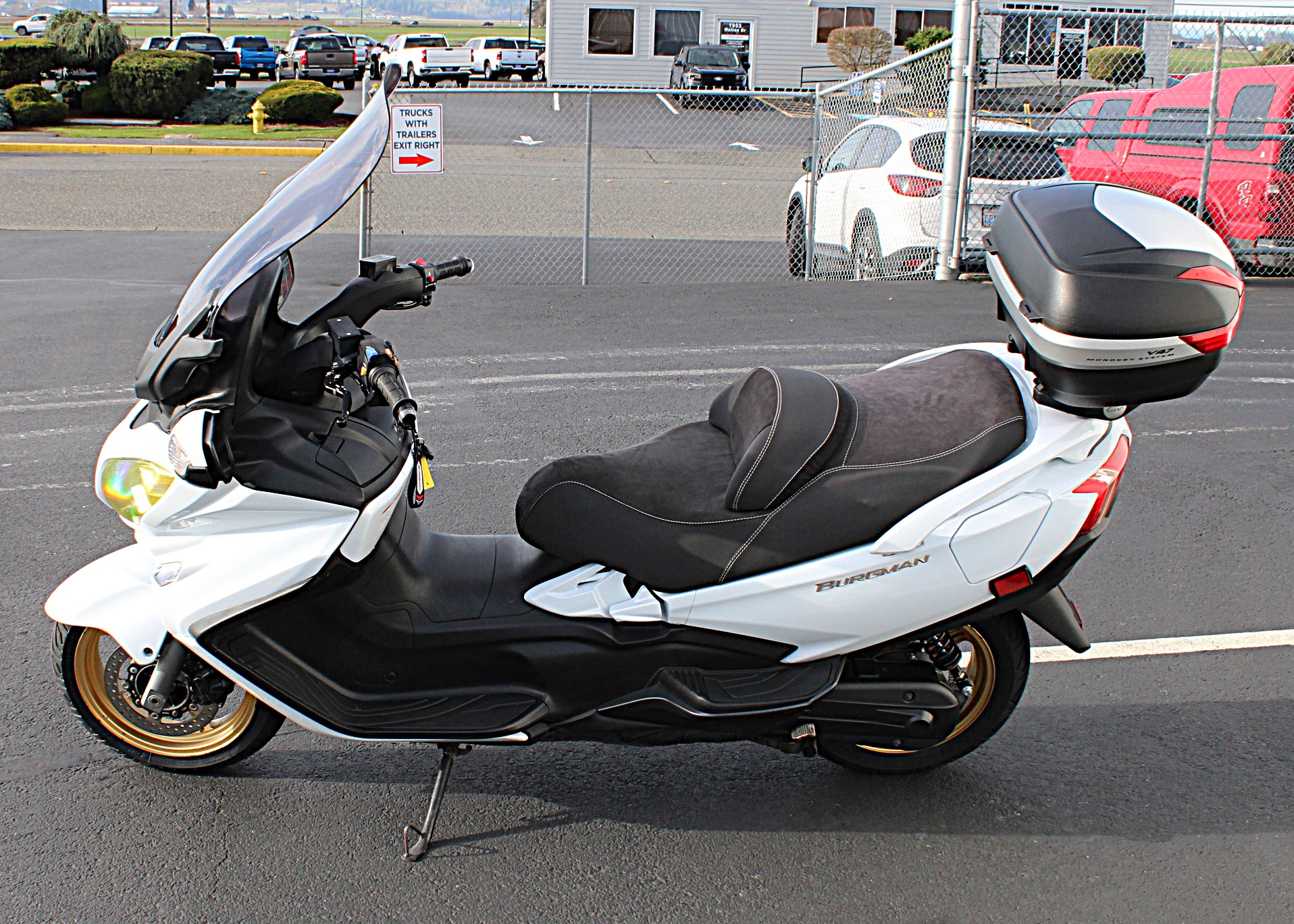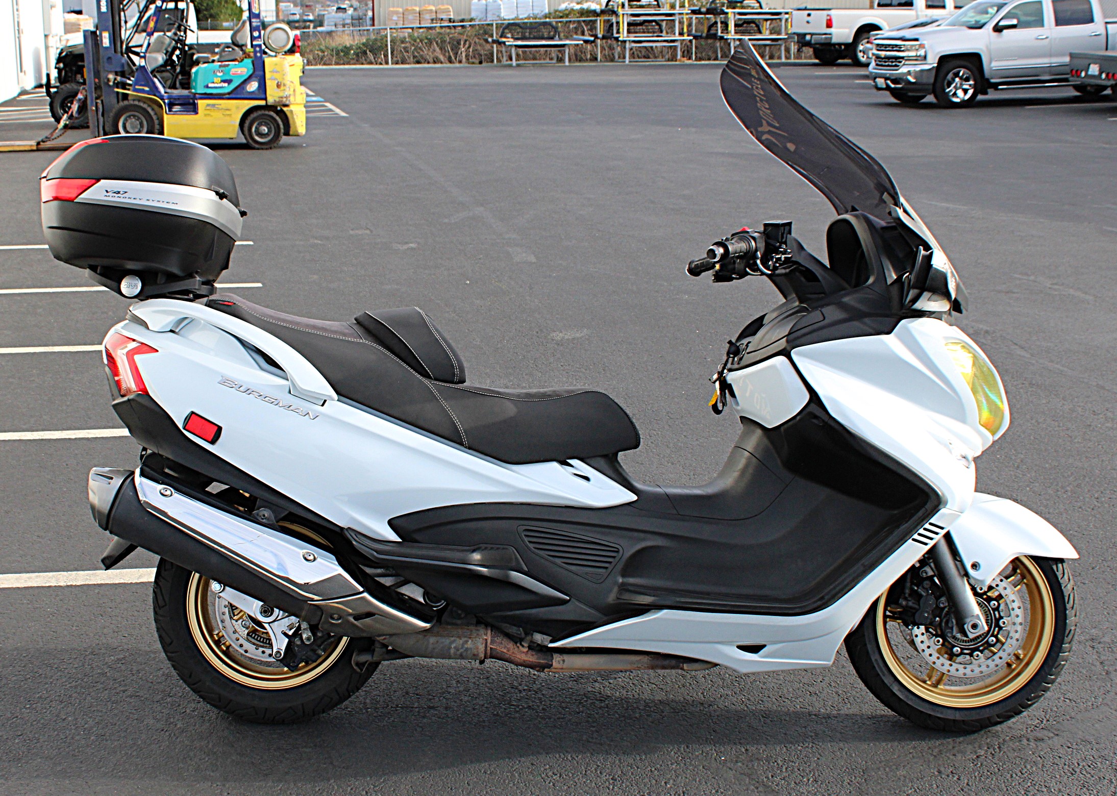 The Suzuki Burgman 650 ABS is a touring scooter style motorcycle with an MSRP of $10,999 and was upgraded for 2013. Power is provided by a 4-Stroke, 638cc, Liquid cooled, DOHC, Parallel Twin engine with Electric starter. The engine is paired with The Burgman 650 ABS rides on Aluminum wheels with a 120/70 R15 M/C 56H front tire and 160/60 R14 M/C 65H rear tire. The front suspension is a Telescopic Fork while the rear suspension is a Twin Sided Swing Arm. Front Dual Hydraulic Disc brakes and rear Hydraulic Disc brakes provide stopping power. The Burgman 650 ABS comes standard with an One-Piece, 2-passenger seat.