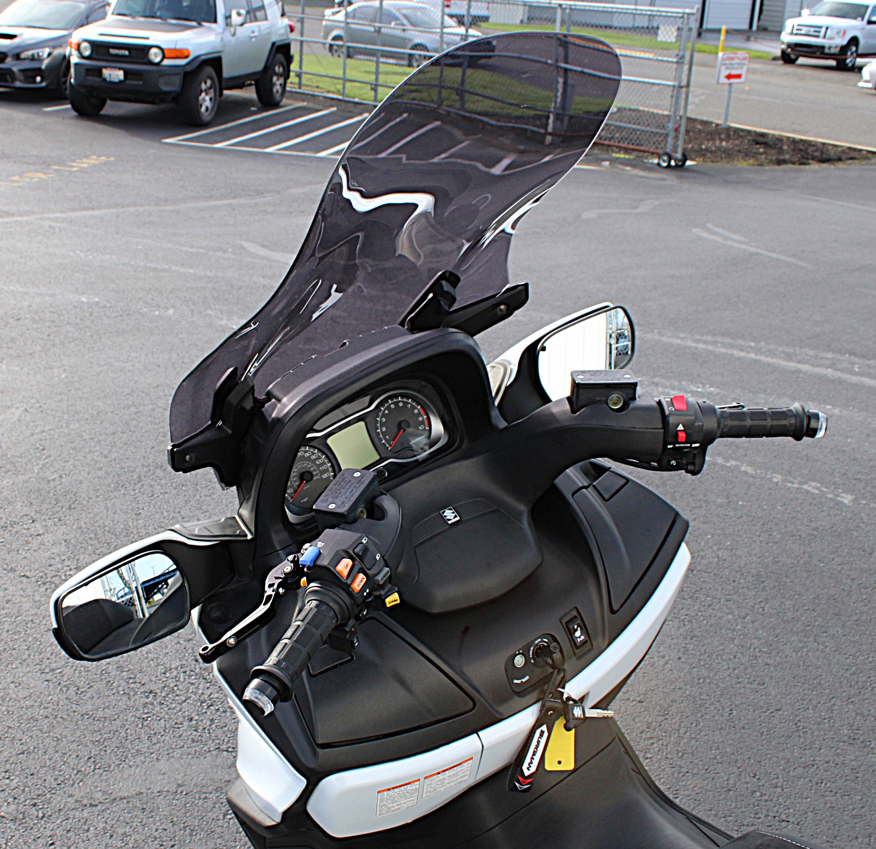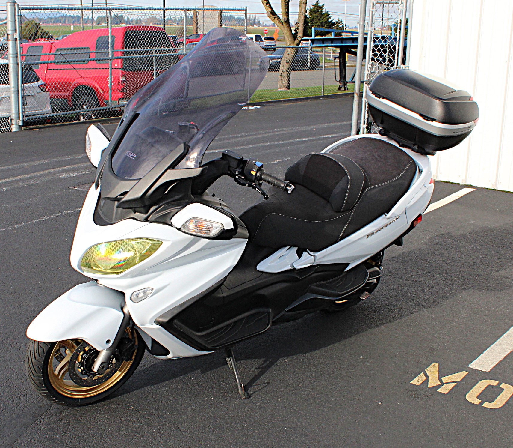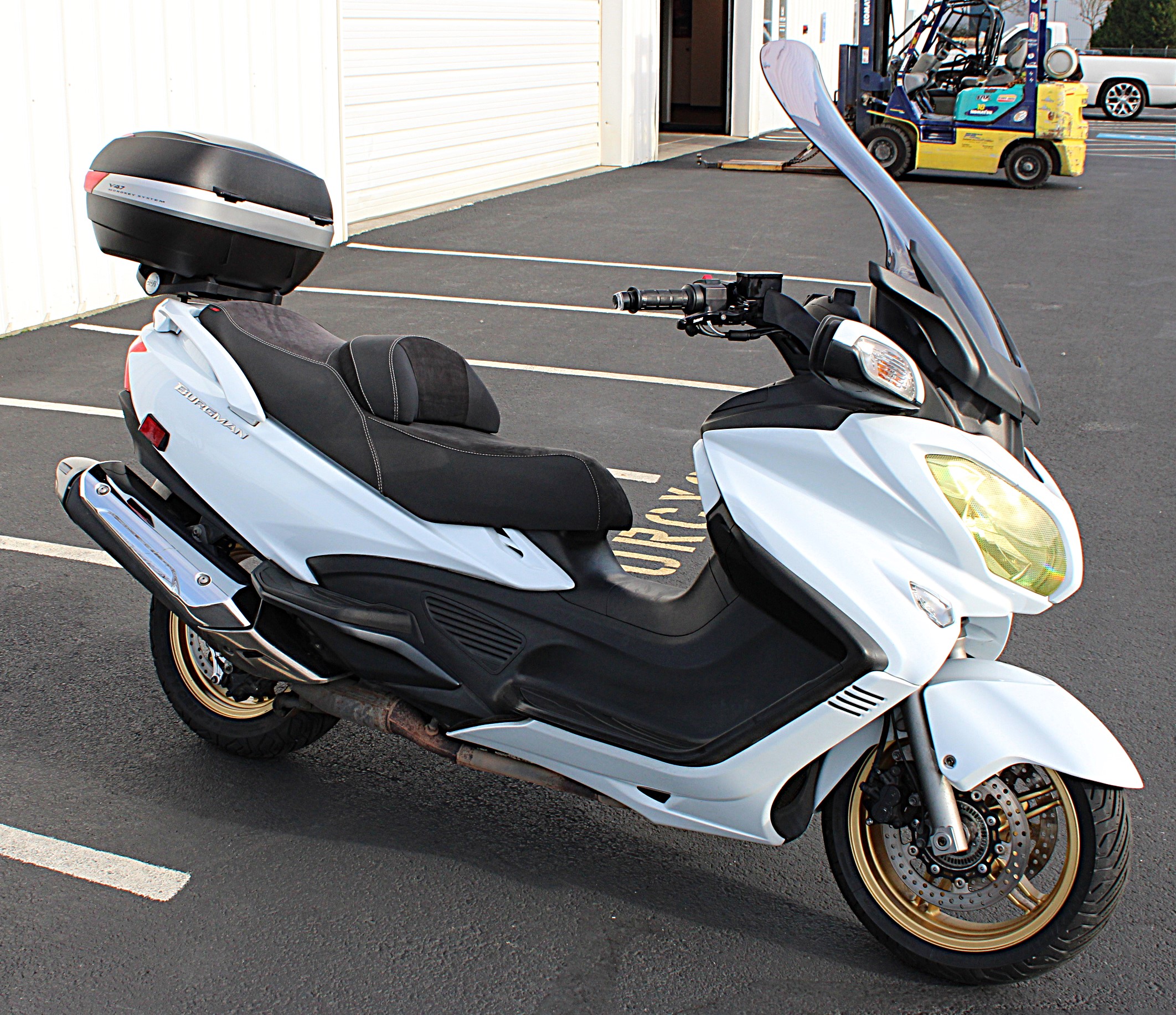 The Suzuki Burgman 650 ABS is a touring scooter style motorcycle with an MSRP of $10,999 and was upgraded for 2013. Power is provided by a 4-Stroke, 638cc, Liquid cooled, DOHC, Parallel Twin engine with Electric starter. The engine is paired with The Burgman 650 ABS rides on Aluminum wheels with a 120/70 R15 M/C 56H front tire and 160/60 R14 M/C 65H rear tire. The front suspension is a Telescopic Fork while the rear suspension is a Twin Sided Swing Arm. Front Dual Hydraulic Disc brakes and rear Hydraulic Disc brakes provide stopping power. The Burgman 650 ABS comes standard with an One-Piece, 2-passenger seat.
