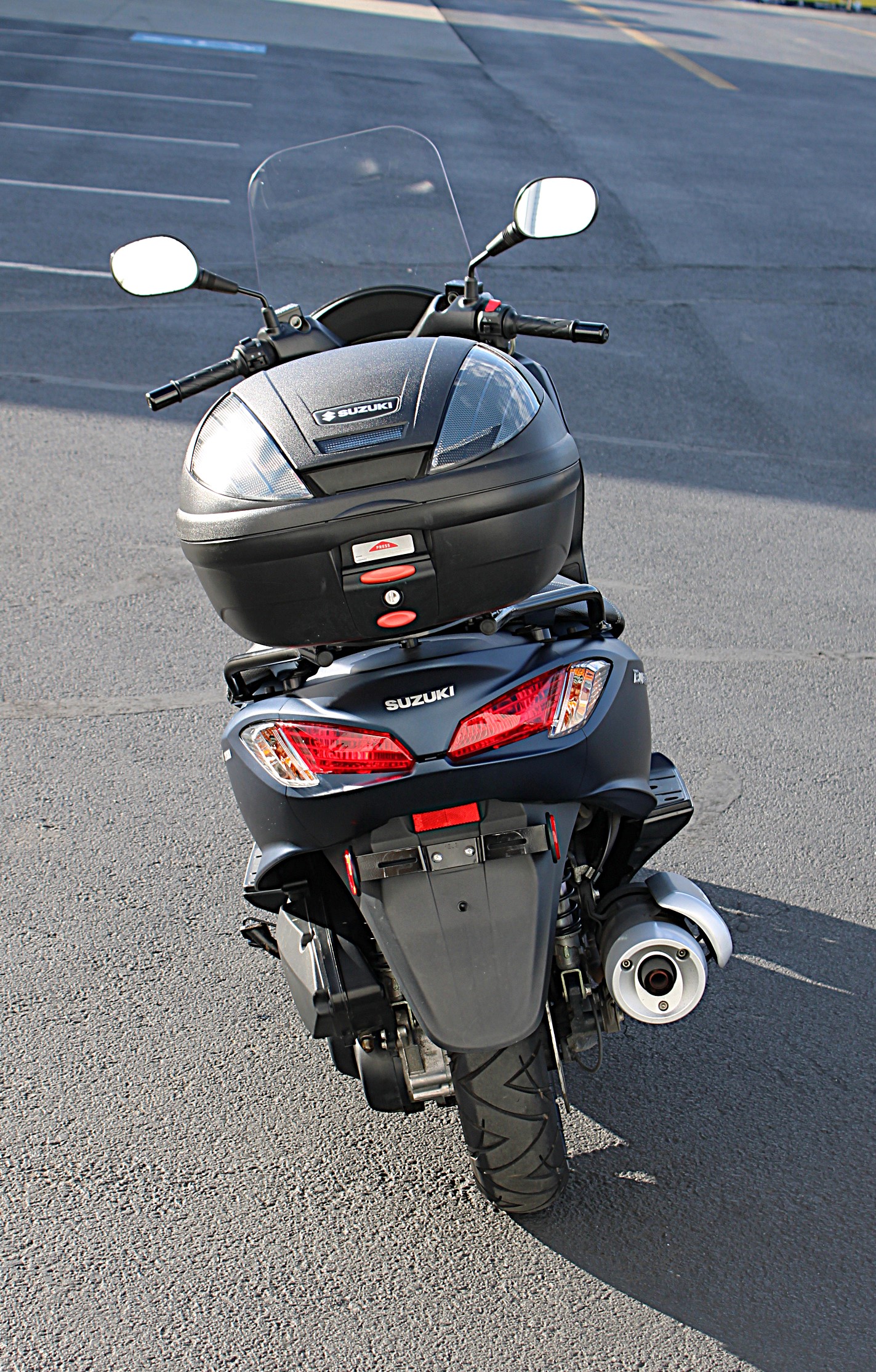 The telescopic oil-damped front fork and swingarm-style rear suspension make the Burgman's ride sporty and smooth.