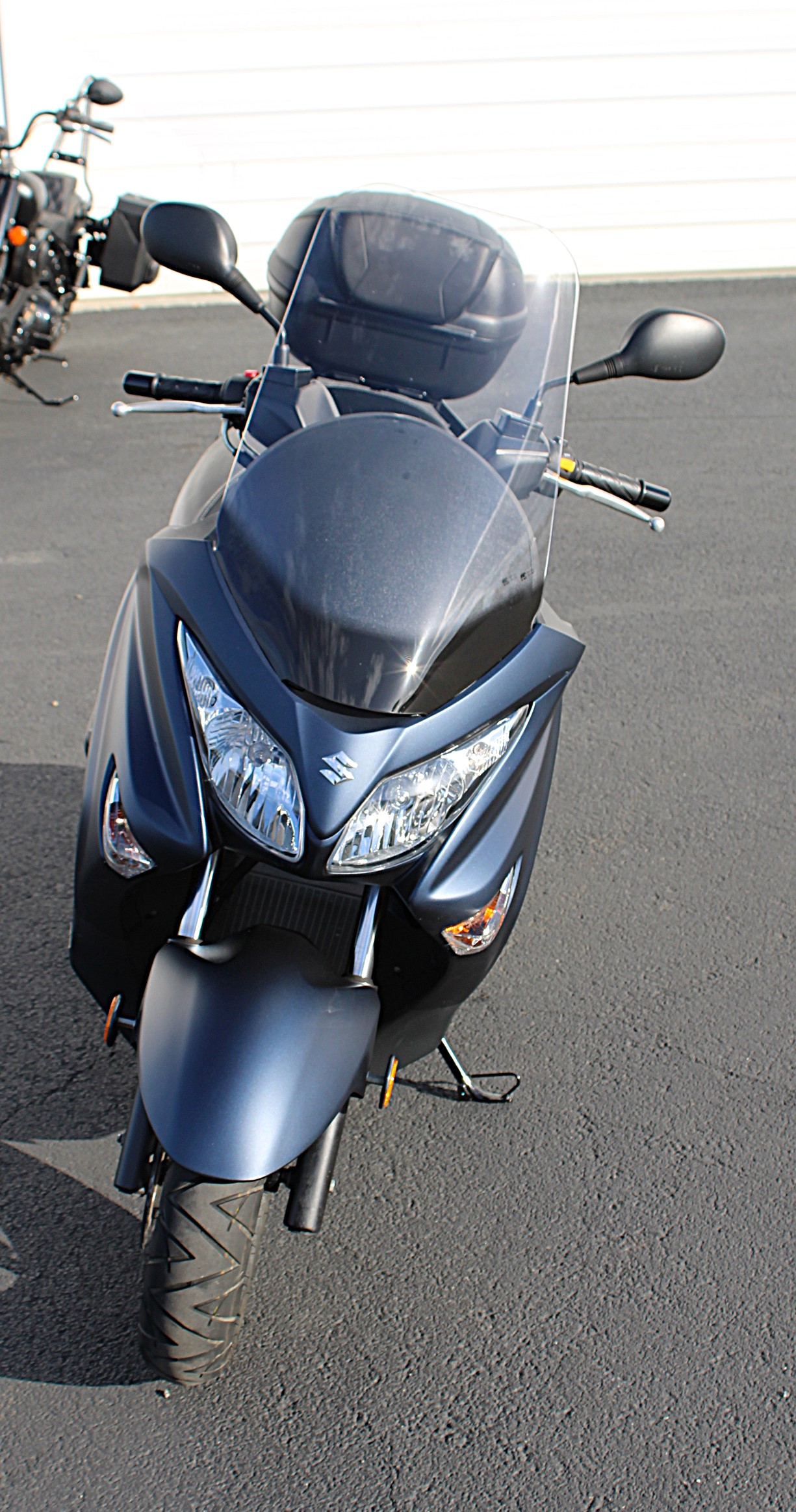Stylized Suzuki “S” 3-D emblems on the front leg shield and the upper meter panel denote the quality and sophistication of the brand.