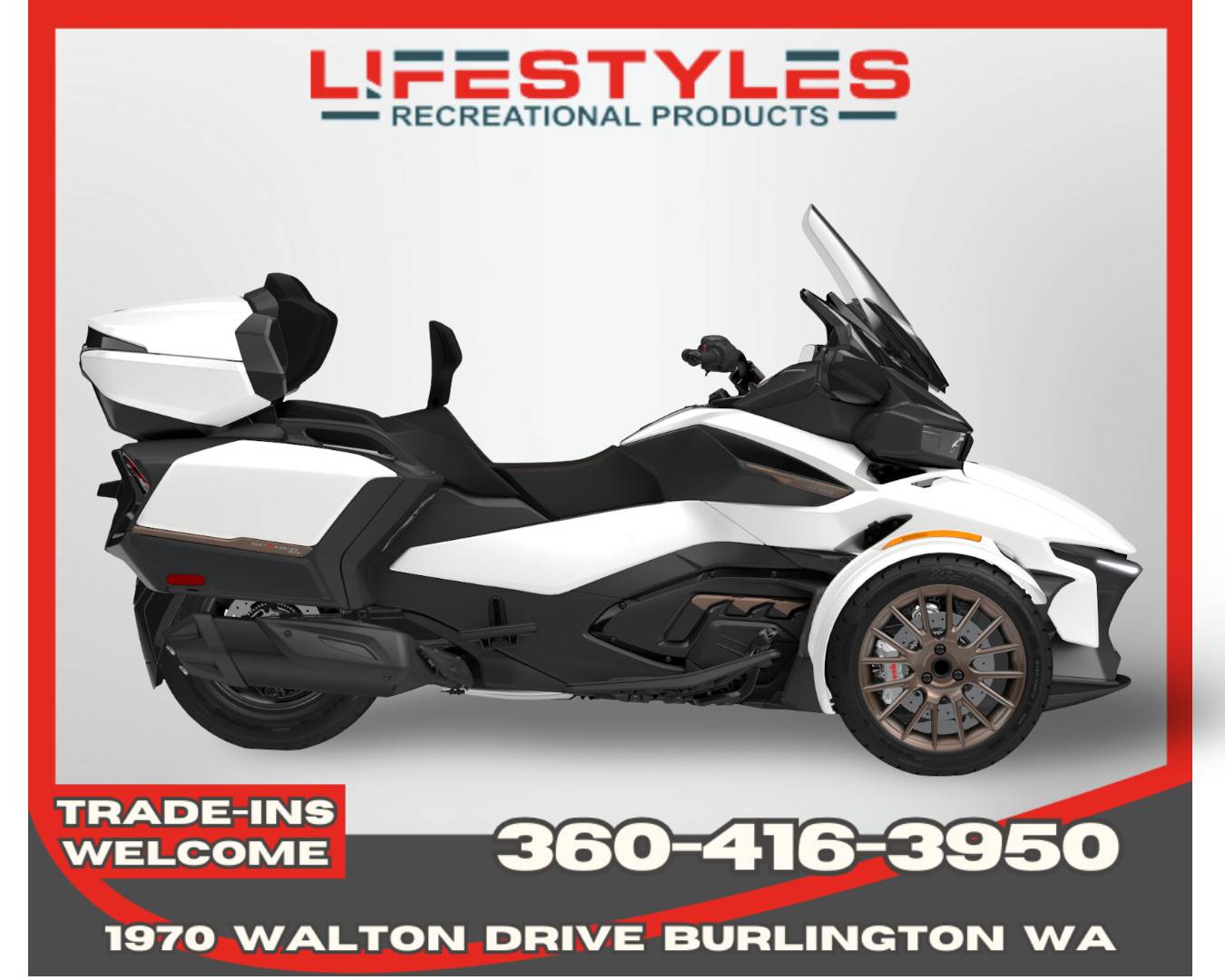 * Sale Price does not include Freight, Set-up, Tax, License and Doc fee.With a modern look, heightened comfort, and extra storage, the Spyder RT isn’t just the key to unlocking what the open road has to offer, it’s the pinnacle of luxury touring.