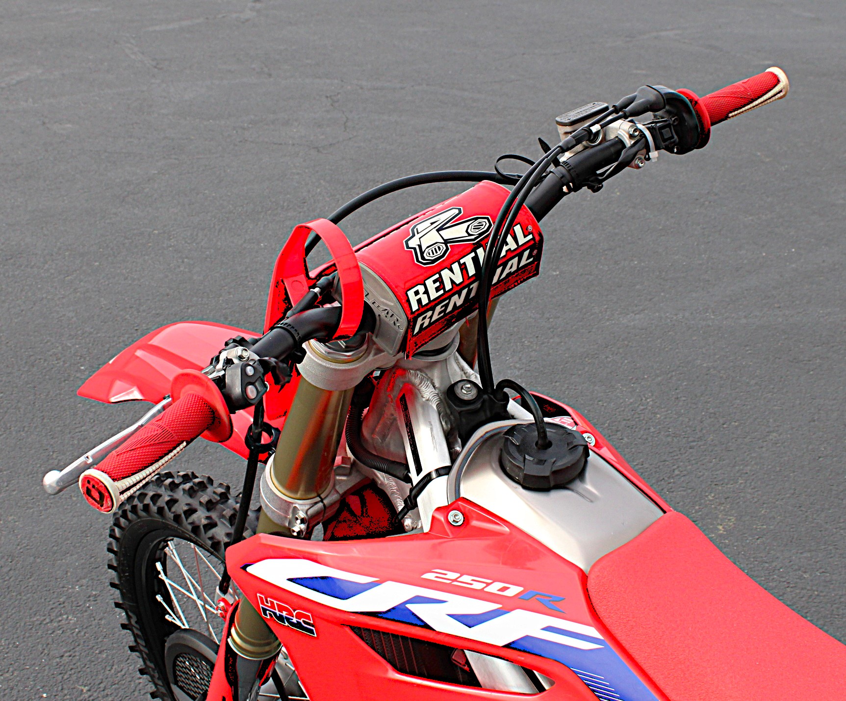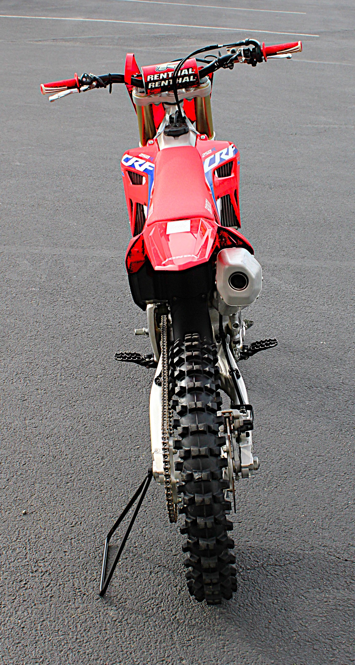 Along with the single-muffler exhaust, the CRF250R naturally uses a single-pipe header. It routes close to the center of the bike, and its light overall construction helps improve weight distribution.