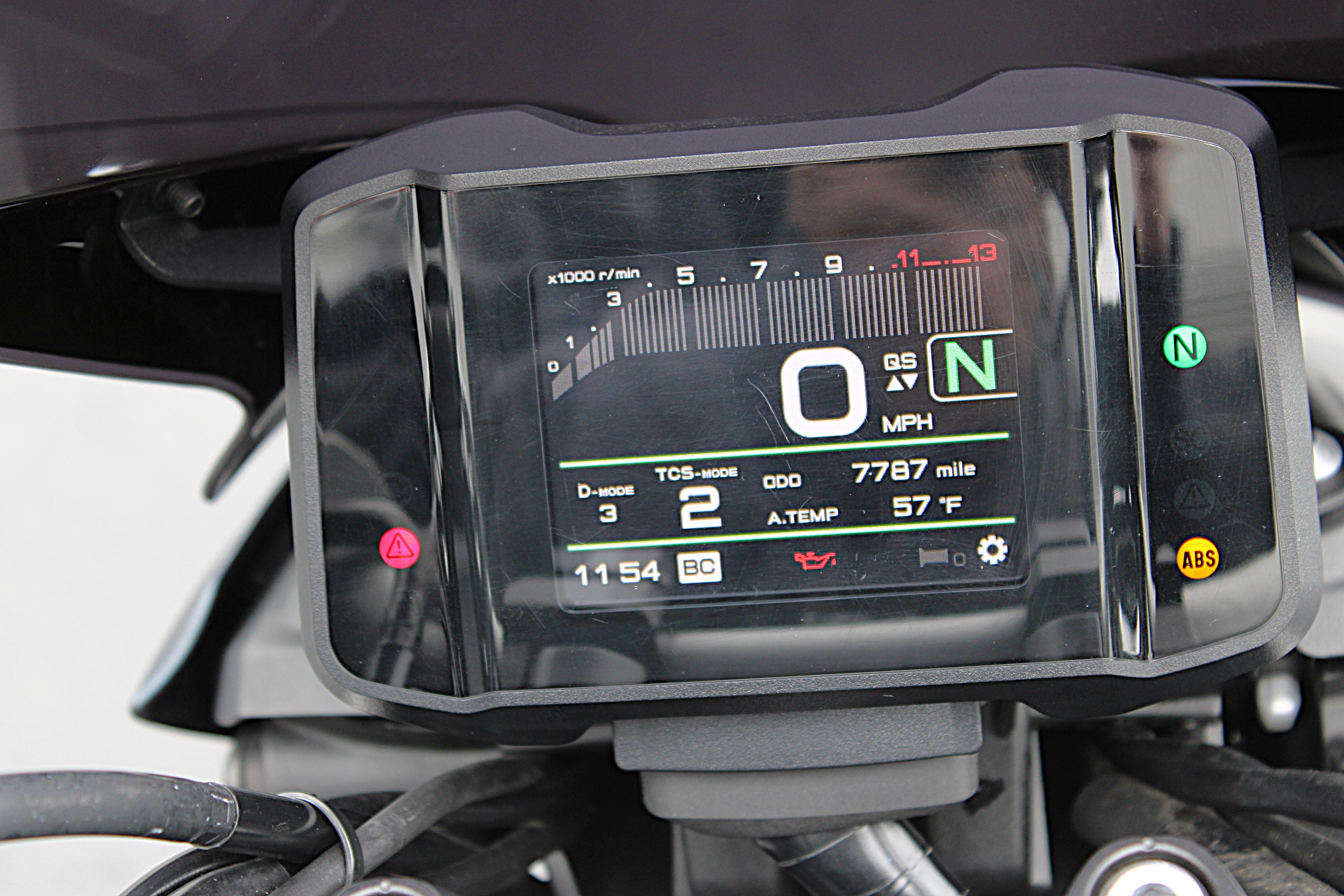 The MT-09 features a 3.5-inch full-color TFT display that features a bar-type tachometer that changes colors as rpm rises or falls, a clock and displays for remaining fuel, average mileage, water temperature, air temperature and a gearshift indicator (color reversed for gear in use). Easily switch between displays and information with the handlebar switches.