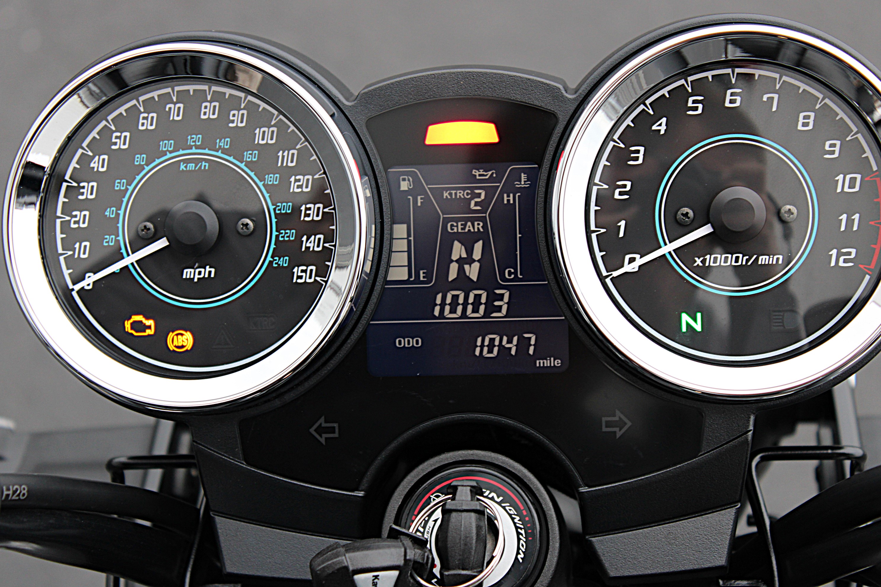 Analog-style speedometer and tachometer dials are complemented by a multi-function LCD screen, bringing both retro and modern styles together. The Economical Riding Indicator appears on the LCD screen when fuel consumption is favorable.